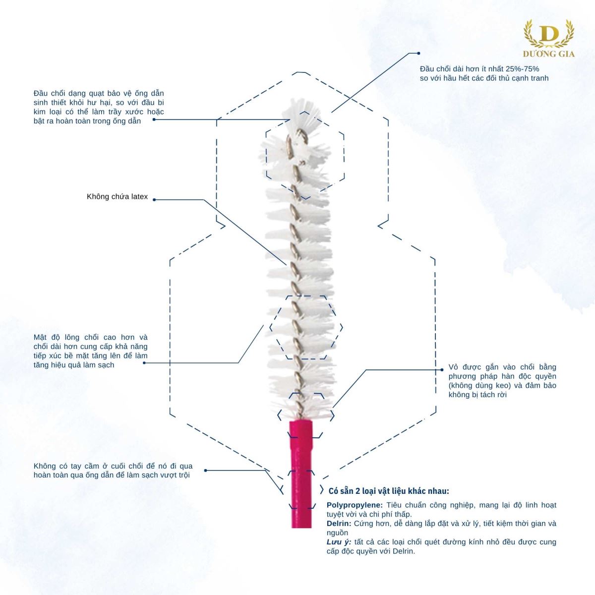 ✔ Chổi cọ chuyên dụng: Có đầu sợi nylon hoặc PBT không gây trầy xước. Có lõi thép bọc để tránh làm hỏng lòng ống. Có độ cứng phù hợp để không làm cong hoặc biến dạng dụng cụ