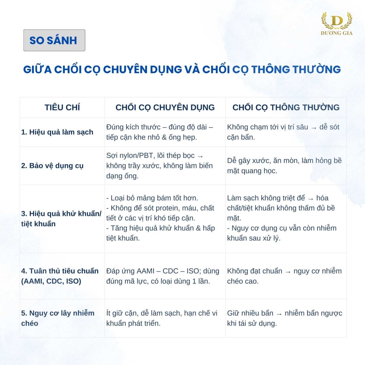 Bạn có biết? Trong làm sạch dụng cụ y tế, ngoài việc dùng hóa chất làm phù hợp, lựa chọn đúng loại chổi cọ cũng quyết định rất lớn đến hiệu quả làm sạch để đảm bảo mọi bề mặt, mọi kênh dụng cụ đều được làm sạch đúng chuẩn, chất lượng dụng cụ và tuổi thọ sử dụng.