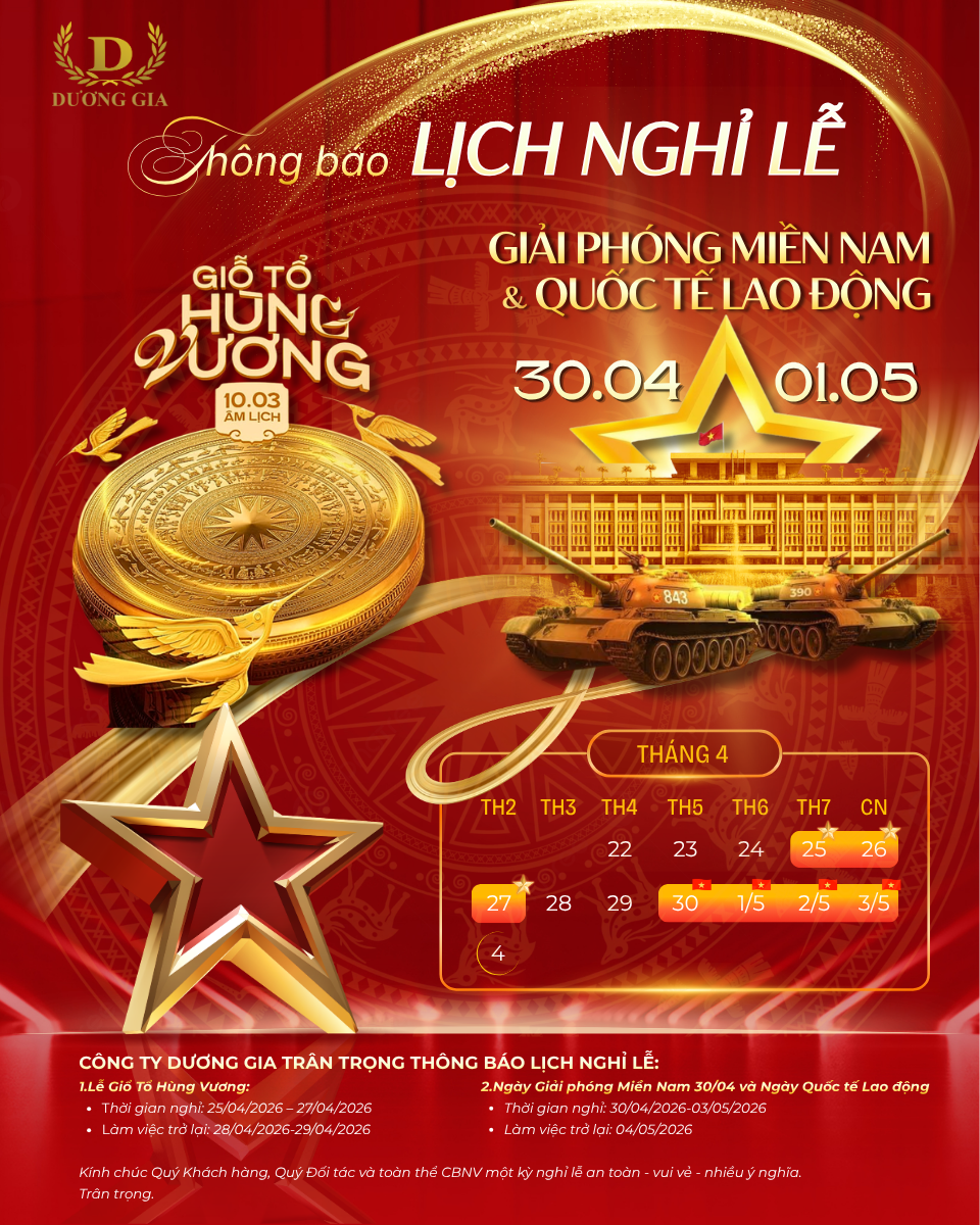 Nhân dịp Giỗ Tổ Hùng Vương (10/03 Âm lịch), Ngày Giải Phòng Miền Nam 30/04 và Ngày Quốc Tế Lao Động 01/05, Công ty Dương Gia trân trọng thông báo lịch nghỉ lễ như sau: