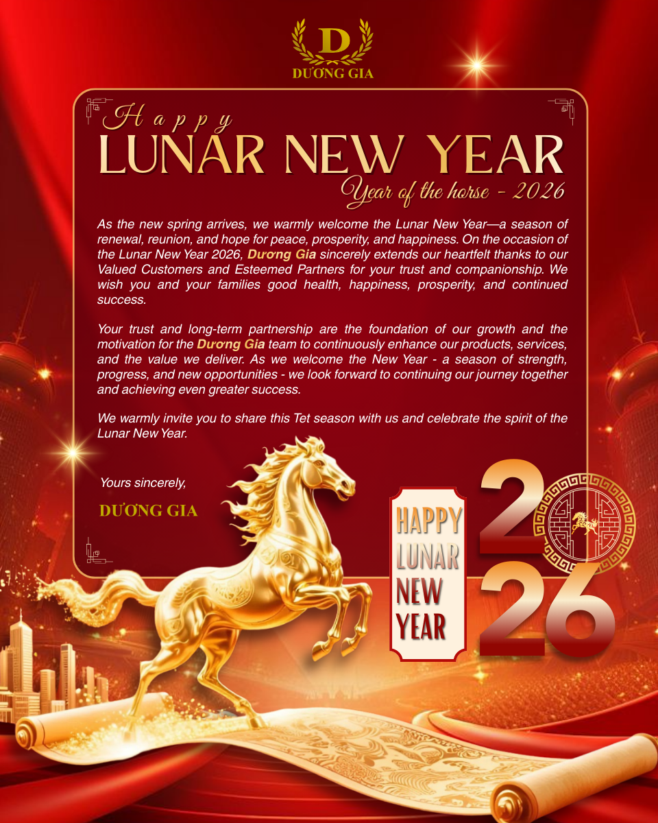 Your trust and partnership are the driving forces that inspire Duong Gia to continuously improve and enhance the quality of our products and services. As we step into the new year—a year symbolizing strength and breakthrough—Duong Gia looks forward to standing alongside you, creating sustainable values and achieving new milestones together.
