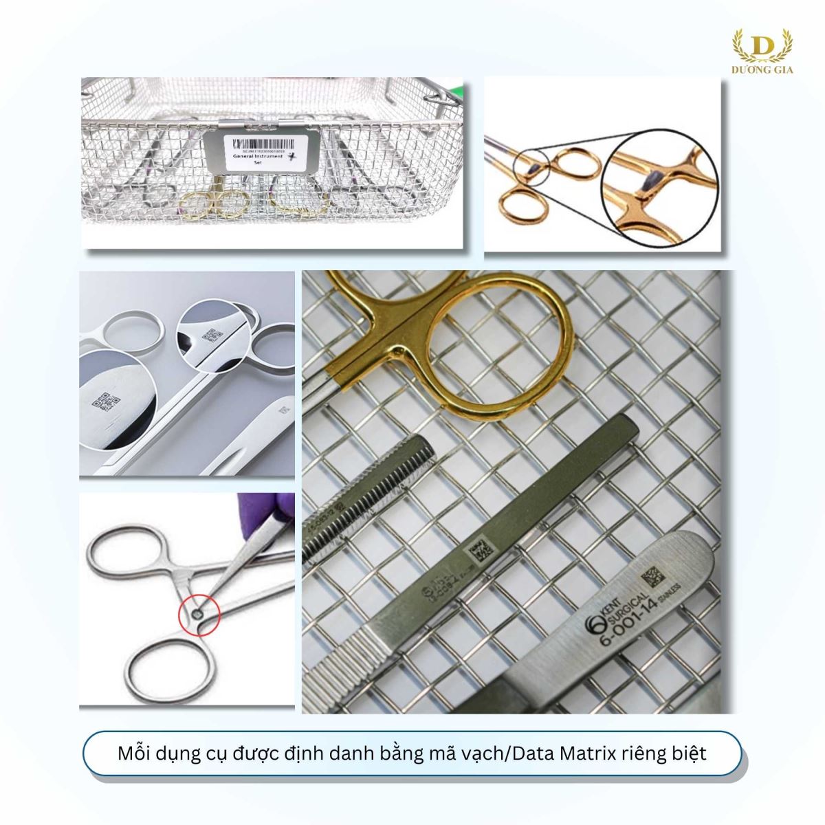 Mỗi dụng cụ được định danh duy nhất bằng mã vạch/Data Matrix, cho phép theo dõi vị trí và trạng thái theo thời gian thực.