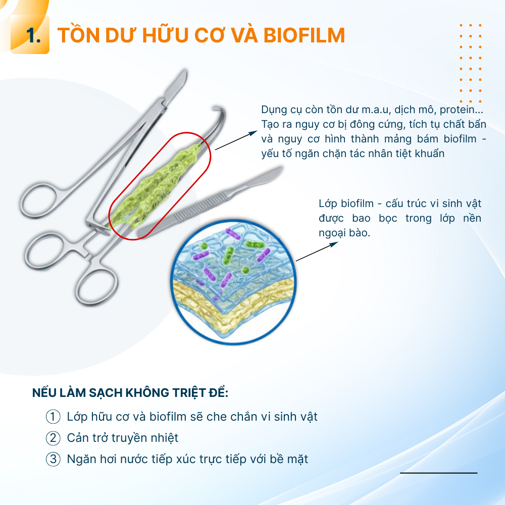 Sau sử dụng, dụng cụ có thể còn tồn dư máu, dịch mô, protein hoặc mảnh vụn hữu cơ. Đặc biệt nguy hiểm là biofilm – cấu trúc vi sinh vật được bao bọc trong lớp nền ngoại bào (EPS), có khả năng kháng nhiệt và hóa chất cao gấp nhiều lần so với vi khuẩn ở dạng tự do.